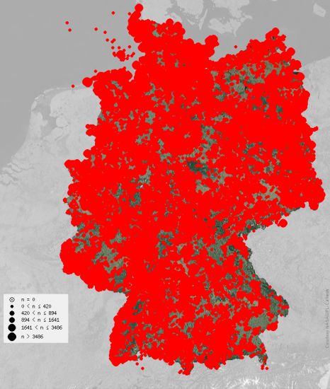Der tägliche Datenzuwachs ist enorm, und im April 2013 wurden erstmals mehr als 500.000 Beobachtungen innerhalb eines Monats gemeldet. Wie die untenstehende Karte der April-Beobachtungen zeigt, stammen die Daten aus fast allen Teilen Deutschlands. Nur für weniger als 100 der insgesamt gut 11.000 Gemeinden Deutschlands wurden bislang noch keine Beobachtungen in ornitho eingegeben. Im bevölkerungsreichsten Bundesland Nordrhein-Westfalen sind aktuell nach wie vor erwartungsgemäß die meisten ornitho-Nutzer beheimatet (13,6%). Die meisten Beobachtungen – über 722.000 – wurden allerdings bislang in Niedersachsen eingegeben, gefolgt von Baden-Württemberg mit rund 627.000 Daten.
